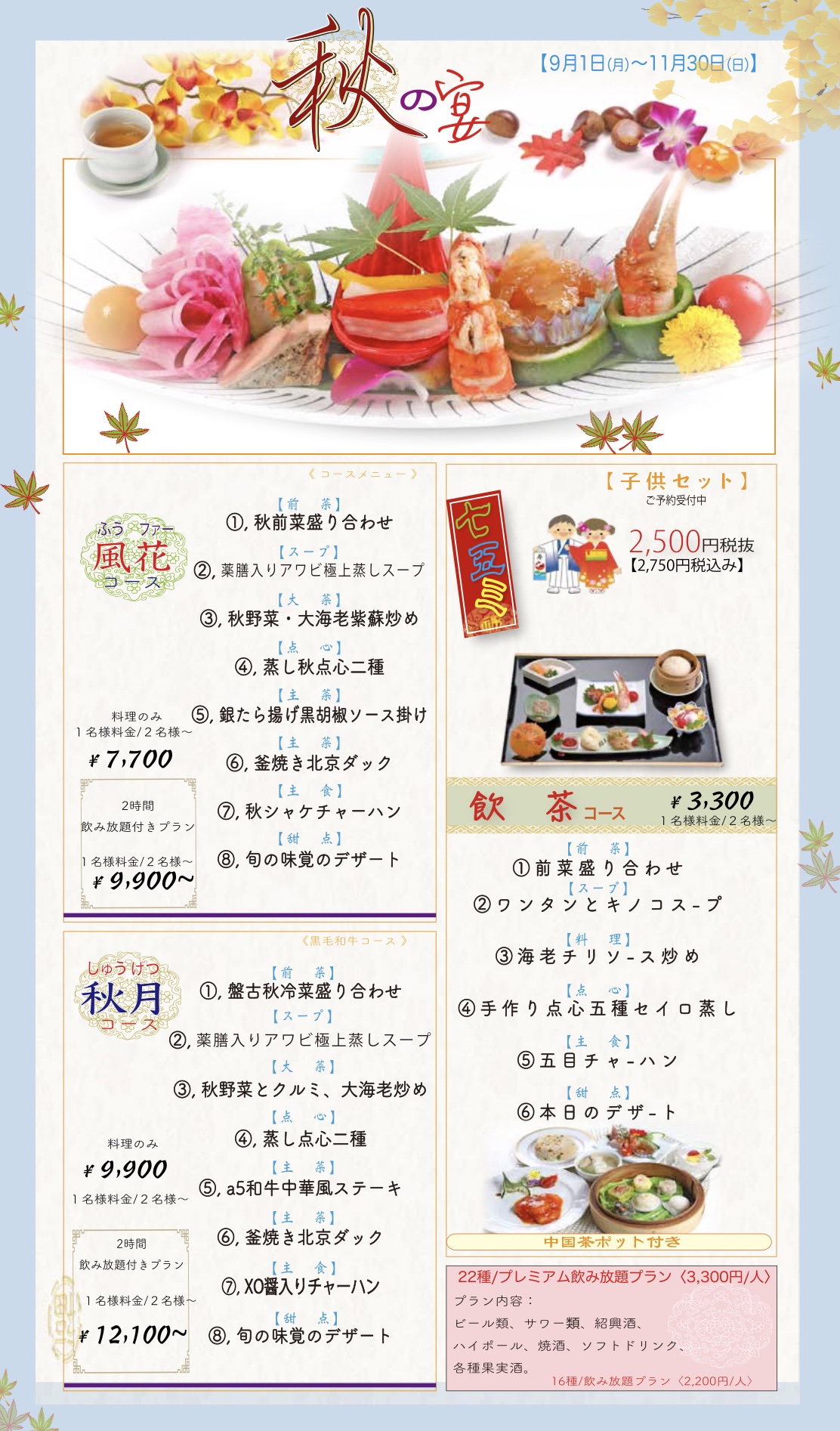 2025年8月13日 / 最終更新日 : 2025年8月13日 盤古殿馬車道TERRACE店 ■◇■ 期間限定:秋の特別コース料理 ■◇■ 2025年09月01日(月)〜 華やかな中華会席《2名様より承ります》七五三の祝席ご予約承ります