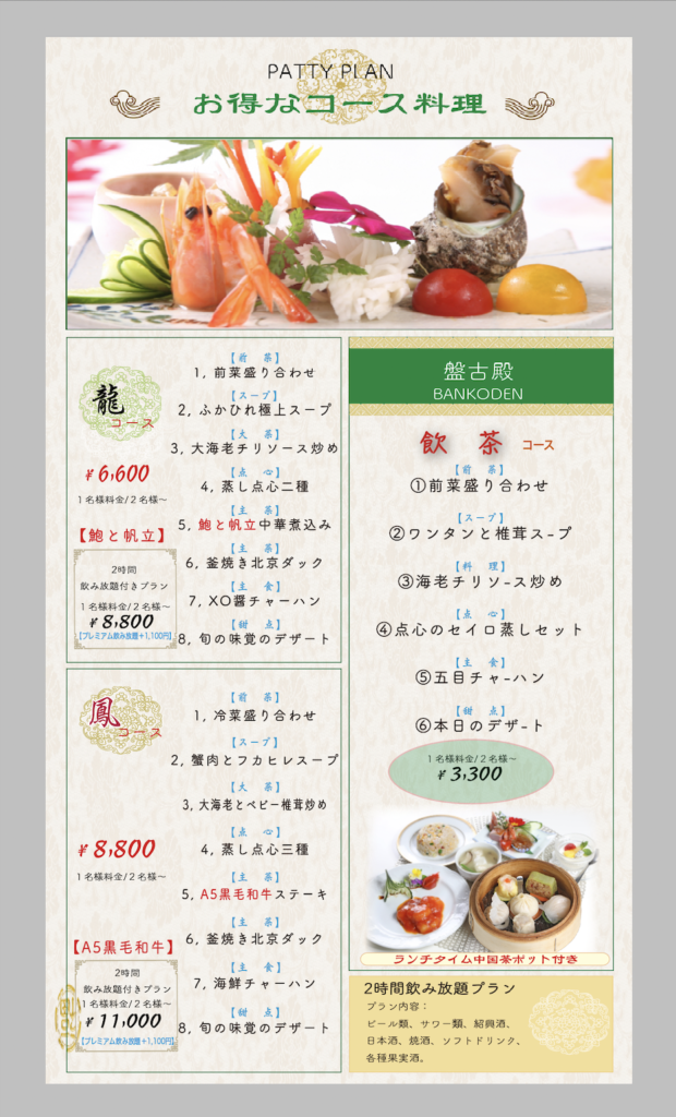 4. 2023年06月01日(木)より■◇■ 2023限定コース ■◇■ =鳳(ほう)A5ランク黒毛和牛ステーキなど全8品¥8,000-(税込¥8,800-)=龍(りゅう)アワビと帆立の中華煮込みなど全8品¥6,000-(税込¥6,600-) 2名様より承ります/生ビール・ワイン・ハイボールが含まれる「プレミアム2時間飲み放題プラン」もございます。